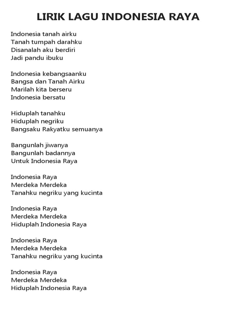 Sudah hafal lagu indonesia raya secara utuh yang terdiri dari tiga bait atau tiga stanza? Download lagu mp3 & video: Tiga stanza lirik indonesia raya bukan hanya lirik semata, namun lebih dari itu, terdapat lantunan harapan dan doa terhadap negara ini. Indonesia raya merdeka merdeka hiduplah indonesia raya. Sebagai lagu wajib nasional indonesia, lagu indonesia raya sering dinyanyikan di upacara peringatan 17 agustus dan acara kenegaraan lain.